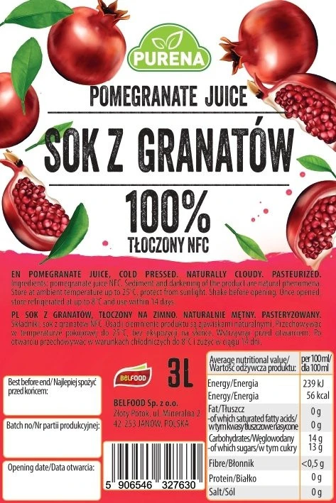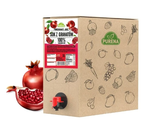 Ten produkt to wyjątkowy sok z granatów 100% NFC (Not From Concentrate) w wygodnym, praktycznym opakowaniu 3L. Został wyprodukowany ze specjalnie wyselekcjonowanych, bardzo dojrzałych i naturalnie słodkich owoców granatu późnych odmian jesiennych. Bogactwo witamin i błonnika oraz wyjątkowo wysoki extrakt wynika zarówno z selekcji najbardziej dojrzałych owoców oraz tłoczenia soku bez późniejszego klarowania