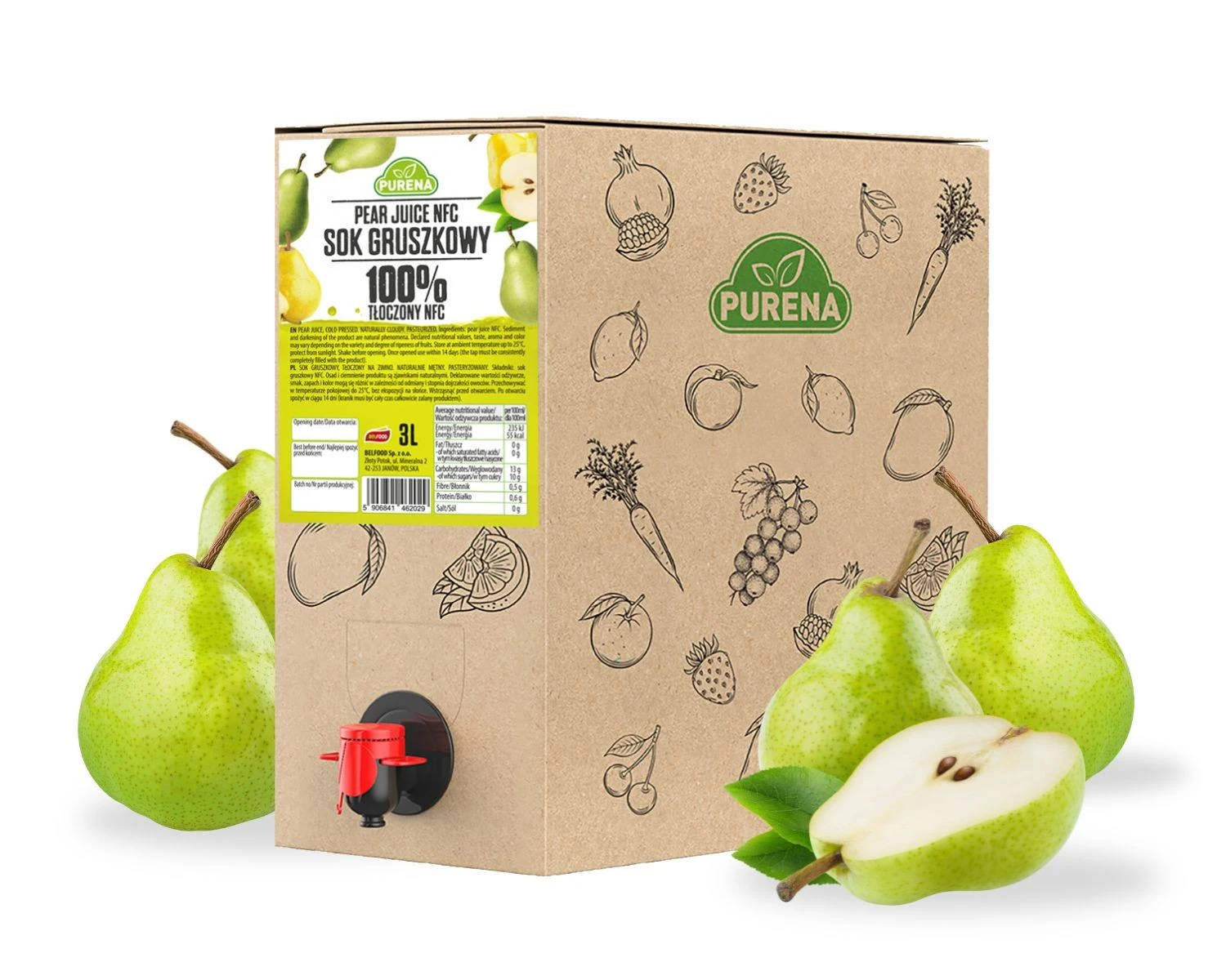Sok gruszkowy 100% tłoczony NFC 3 L w eleganckim kartonie z kranikiem - łagodna słodycz natury zamknięta w każdej kropli.